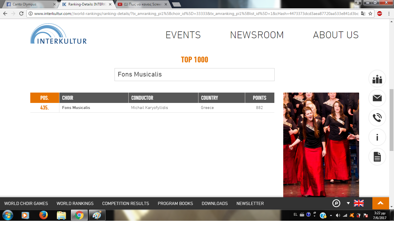 Στη λίστα διακρίνεται με το παλιό της όνομα (Fons Musicalis) αφού η χορωδία μας μετονομάστηκε σε Canto Olympus τον περασμένο Δεκέμβρη ,δύο μήνες μετά την νίκη του παιδικού τμήματος στον Διεθνή Διαγωνισμό της Interkultur !!!